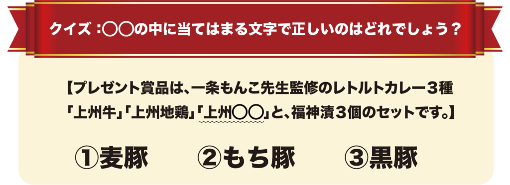 | ク イ ズ | 【クイズ】 「◯◯の中に当てはまる文字で正しいのはどれでしょう?」 【プレゼント賞品は、一条もんこ先生監修のレトルトカレー3種「上州牛」「上州地鶏」「上州◯◯」と、福神漬3個のセットです。】 |